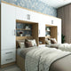 يتكون التصميم من سريرين مريحين يتوسطان دولابًا أنيقًا يحيط بهما من الجانبين ومن الأعلى، ليمنح الغرفة مظهرًا متناسقًا ومساحات تخزين وفيرة