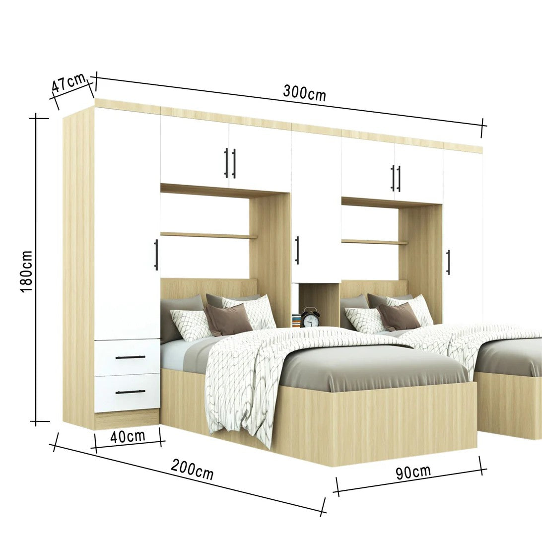 المقاسات : الغرفة تحتوي على سريرين مفردين (90×200 سم لكل منهما)، تحيط بهما 3 دواليب (عرض 40 سم لكل دولاب) مع درجين وخزانتين علويتين (عرض 90 سم، ارتفاع 180 سم)، بعرض علوي إجمالي 300 سم