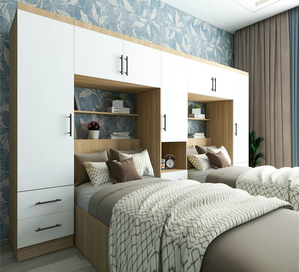 يتكون التصميم من سريرين مريحين يتوسطان دولابًا أنيقًا يحيط بهما من الجانبين ومن الأعلى، ليمنح الغرفة مظهرًا متناسقًا ومساحات تخزين وفيرة