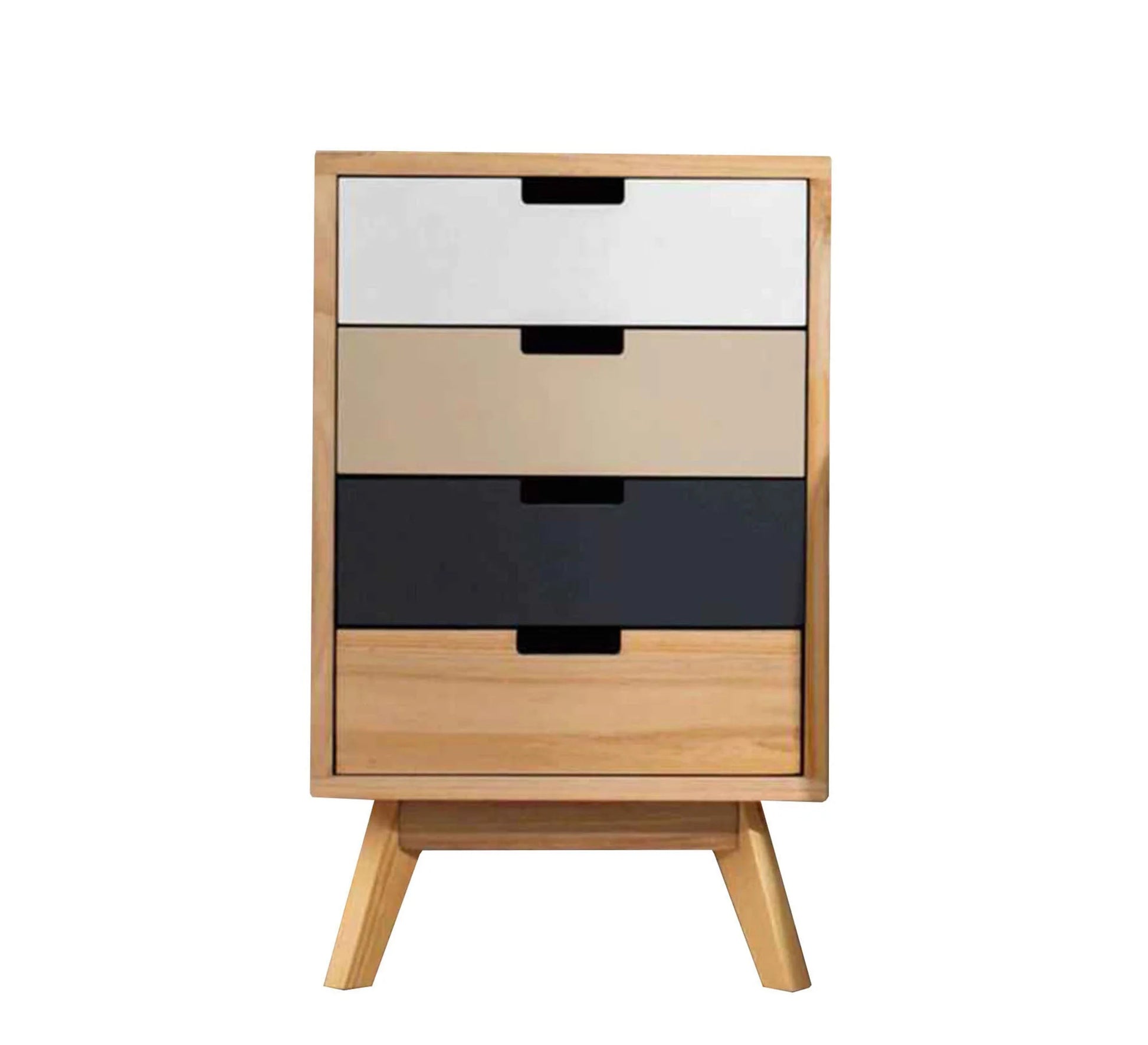 الوحدة جاية بتصميم راقي باللون الخشبي الطبيعي مع لمسة من السكري والأبيض والرمادي وأرجل مرتفعة أنيقة وبتتكون من أربع أدراج عملية